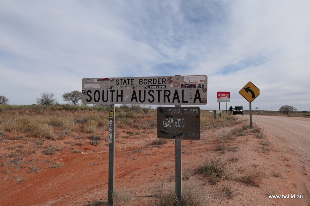 We entered Camerons Corner through a gate in the dog fence and a sign which told us we were entering South Australia, Just before the entrance to the Camerons Corner Store/Pub is an area where the plinth marking the exact location where the Queensland, NSW and South Australia borders meet. The pub itself is in Queensland.