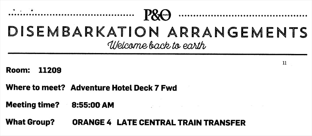 Sure enough when I returned to my room there was the disembarkation letter waiting for me, listing my group, my meeting time and place. The arrangements were actually different to the information I had previously been given regarding my transfer to Central (train) Station so I rang the Guest Services to check but was told just go by the letter.