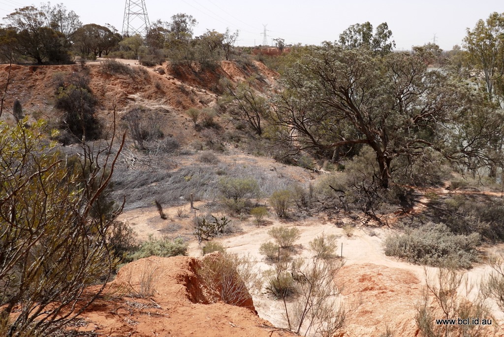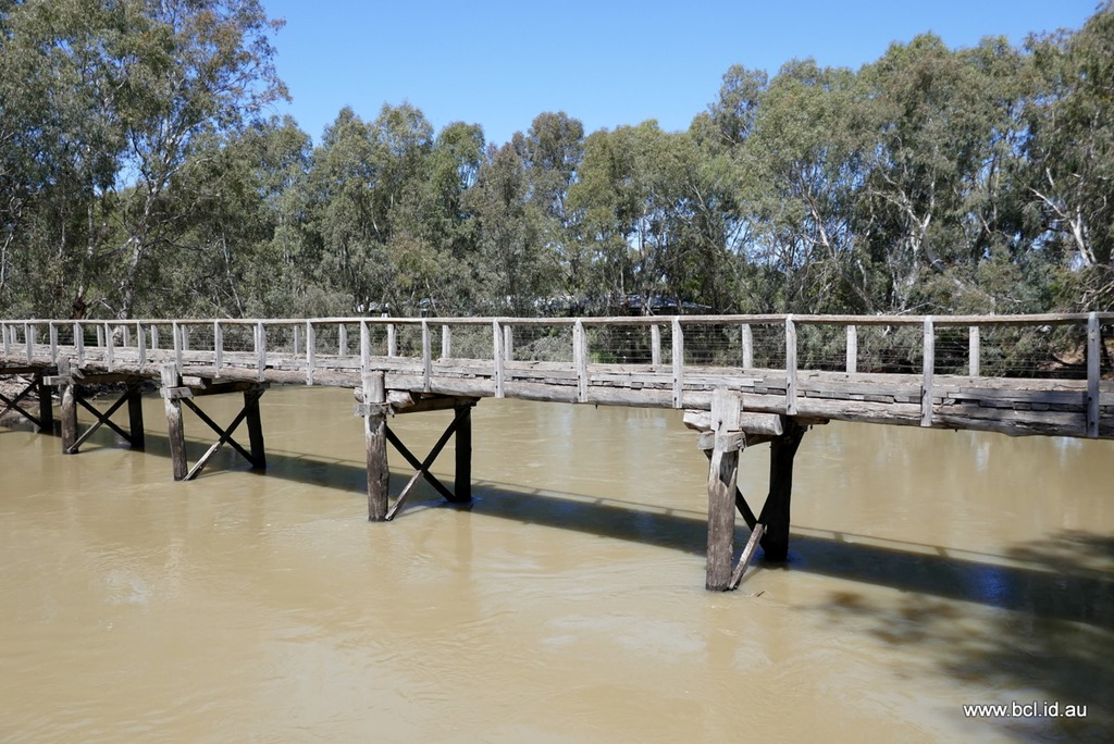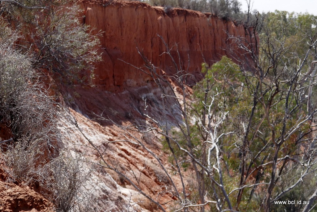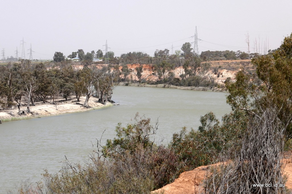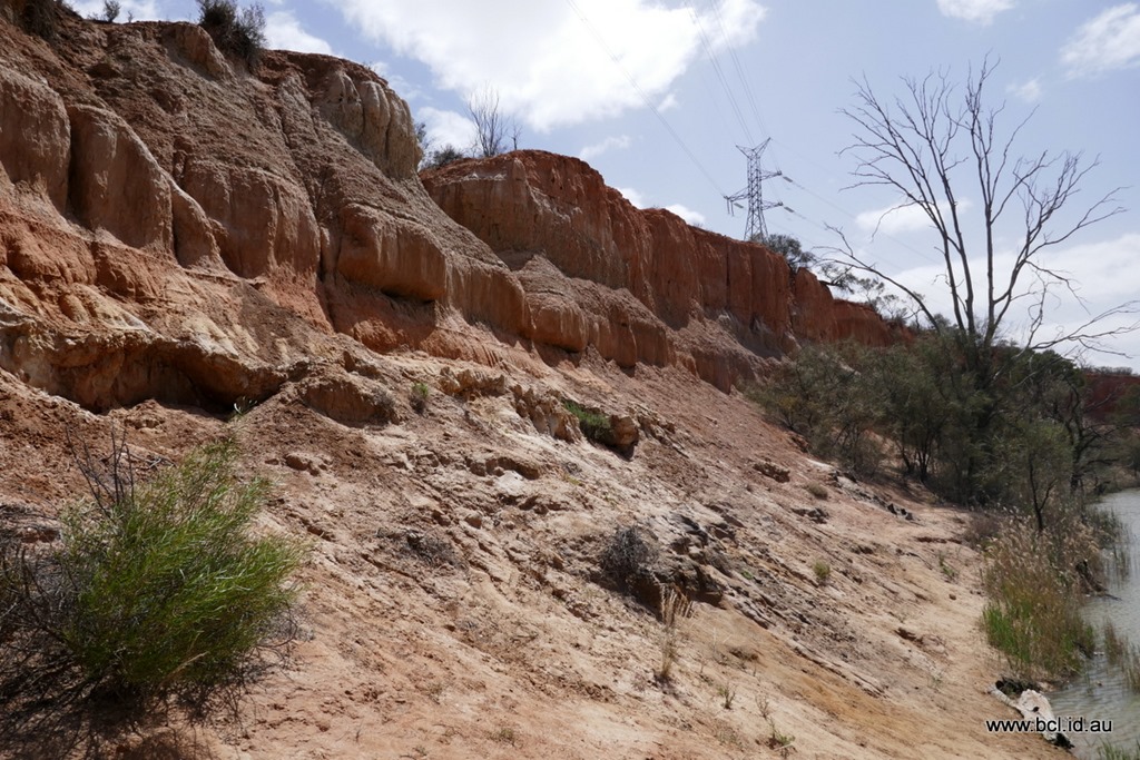 According to the local tourist guide there is an interpretive walk near the pumping station on the river and a board walk to view the red cliffs on/of the river bank which gave to town its name. Found neither… Did find the pumping station which was behind high, locked fences and the car park where the board walk was supposed to commence. In the end I scrambled along a difficult track and did get a glimpse of the cliffs (I think) but it looked as if the whole area was neglected and only used by dirt bikes.