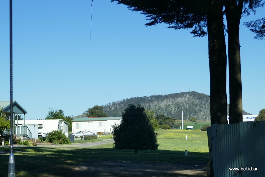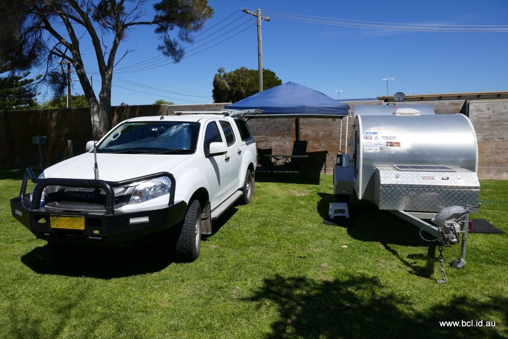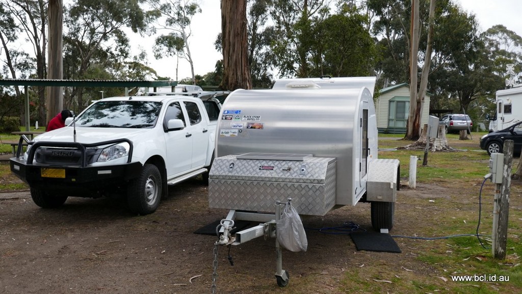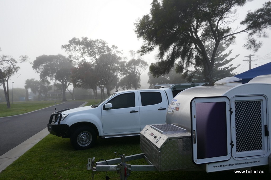 Arrived at a caravan park mid afternoon, paid for two nights and settled in. The park is a bit run down but quite adequate There is a covered BBQ area behind our site so no need for the gazebo, not that there is any sun anyway.