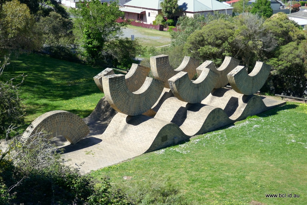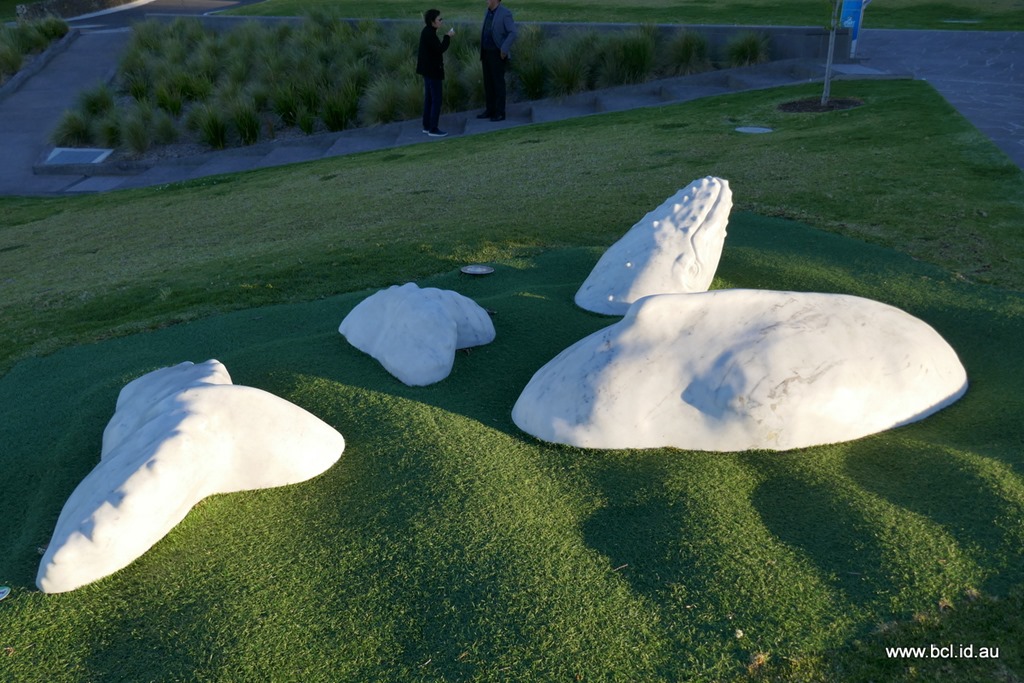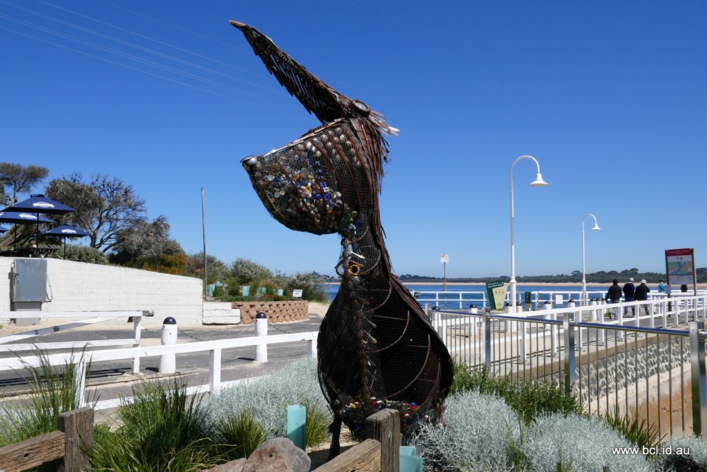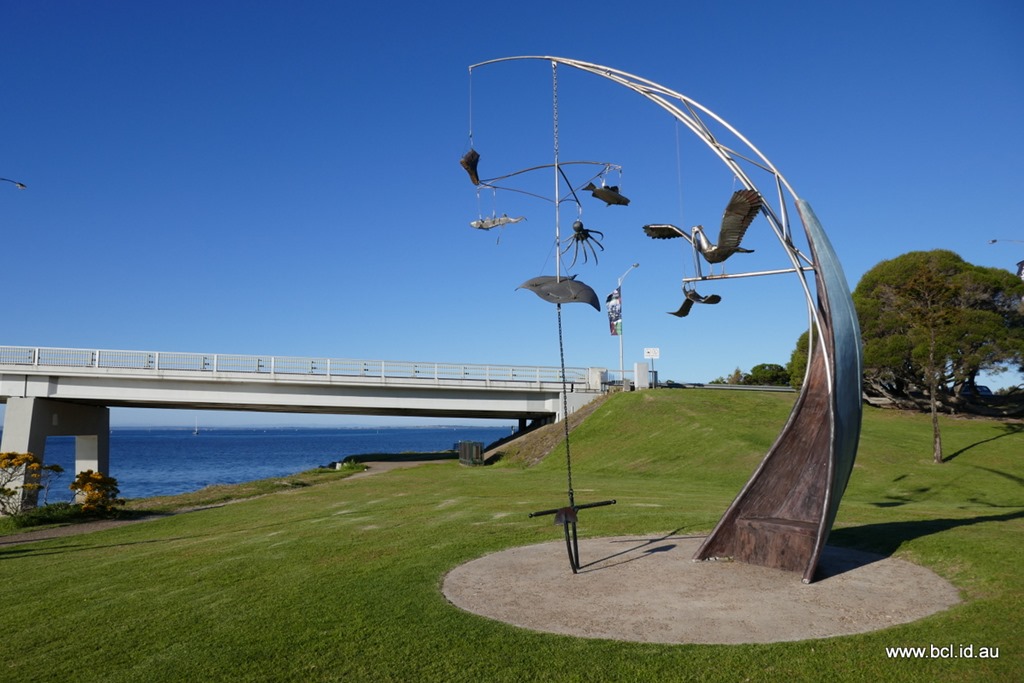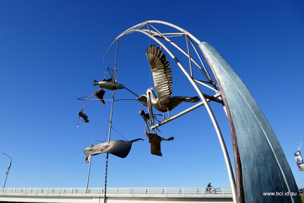 Back at the caravan park spent the late afternoon enjoying the sunshine. Dismantled the gazebo at about 6pm before walking back to the shopping centre to look for dinner. Strolled across to a sculpture by the bridge before deciding on Thai food again.