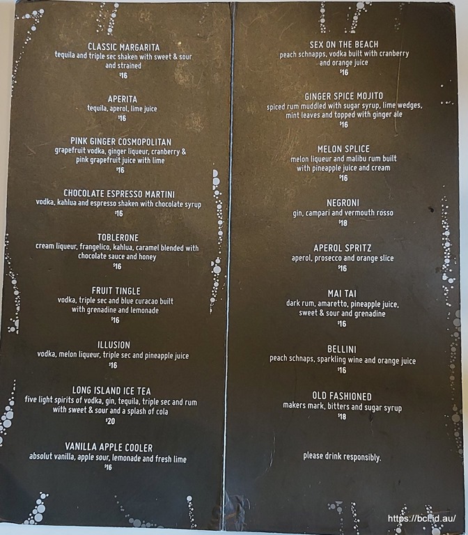 While I was in the Blue Room had a look at the cocktail menu, it seems to have quite a variety of cocktails if you like that sort of thing though personally I stuck with VB.