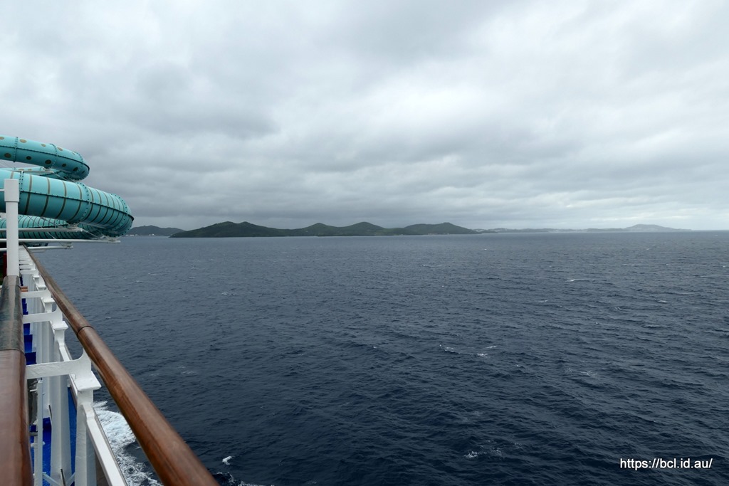 As I walked the islands came into view and the ship started to slow and by the time I had showered we were stationary and presumably anchored. Soon there was a tender floating off my side of the ship.
