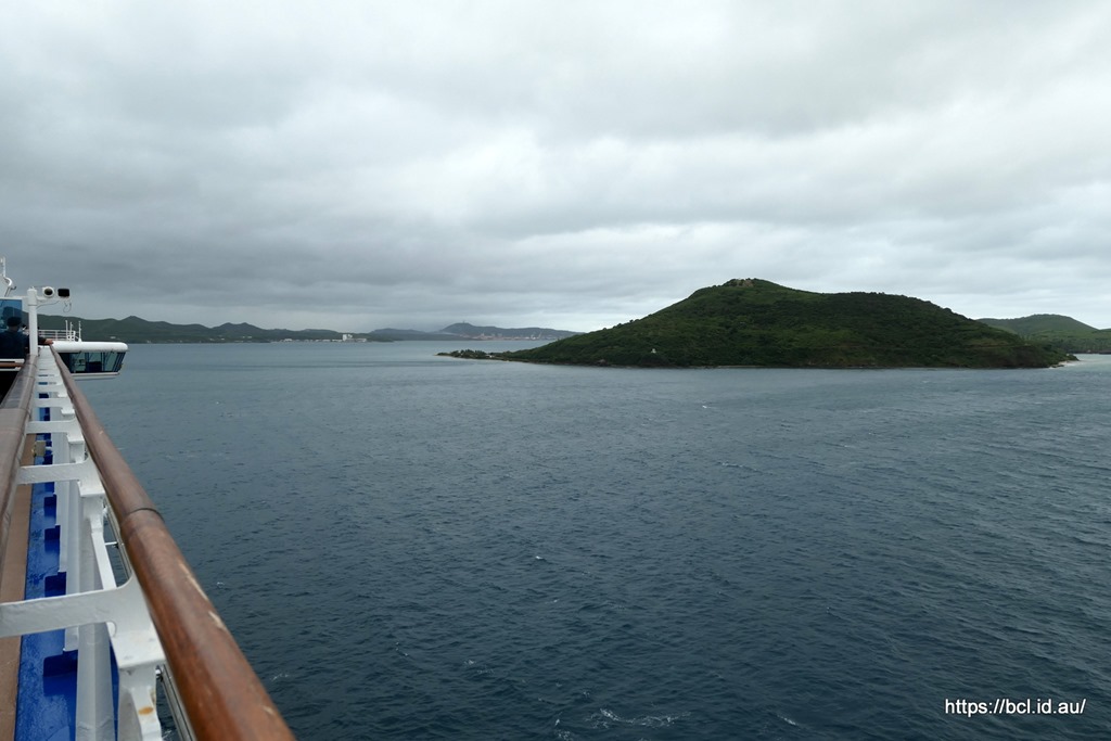 Once again it is a cloudy morning but warm – 30°C at a guess, during my walk there was even a few spots of rain but nothing spectacular. I notice that my knee is hurting a bit so instead of the stairs at the stern of the boat I kept to the one level for the last couple of circuits. Out of interest I timed my regular morning walk – it takes five and a half minutes to do the circuit with the stairs. I usually see the same people every morning doing exactly the same thing (except they do it much faster).