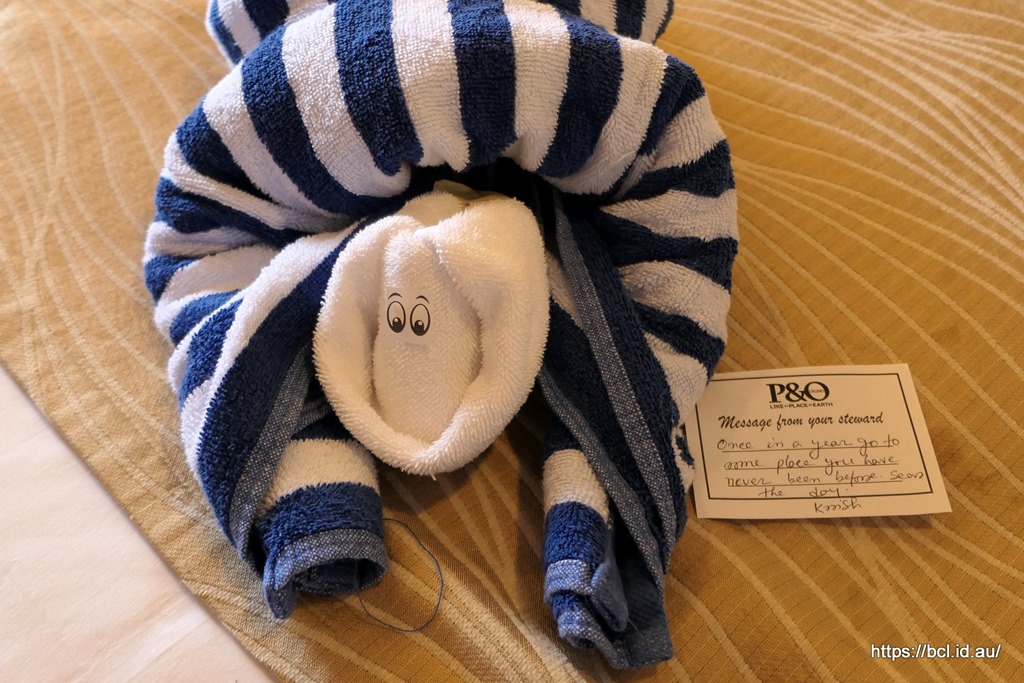 Today’s towel arrangement was even more bizarre than usual but did include a Christmas Card from the Captain. I can’t complain about the cabin or the steward, everything was kept spick and span.